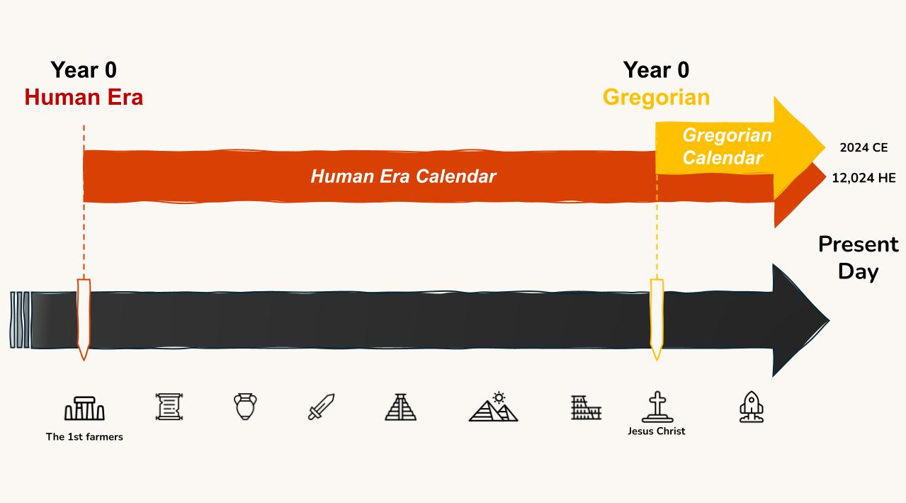 The Human Era Calendar resets Year 0 to 12,000 years ago, reflecting the true age of human civilization.